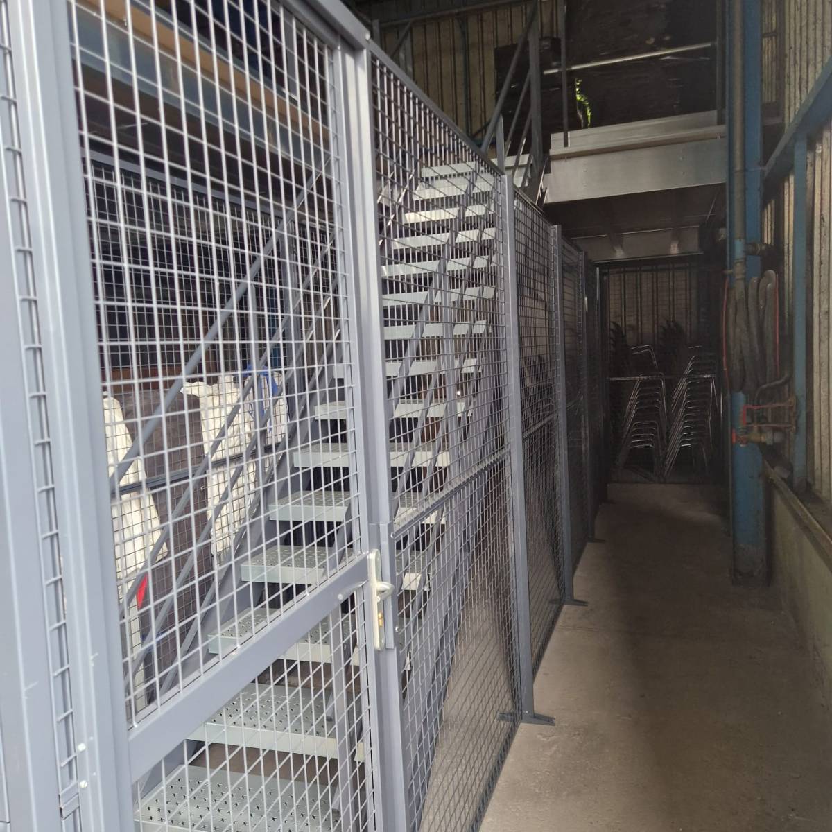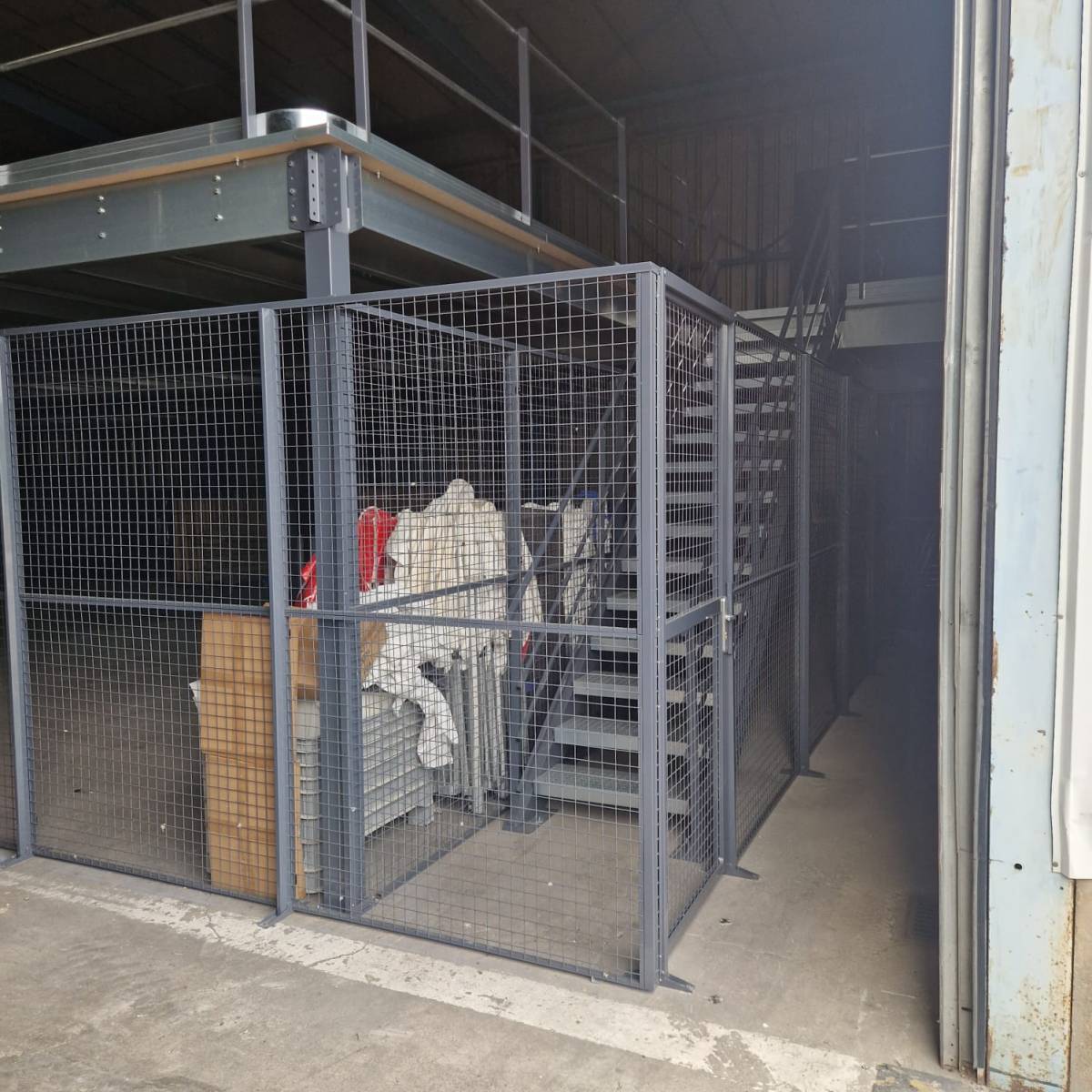 Les accès au rez-de-chaussée et à l'étage ont été condamnés dans les 2 cas par cloisonnements grillagés industriels.