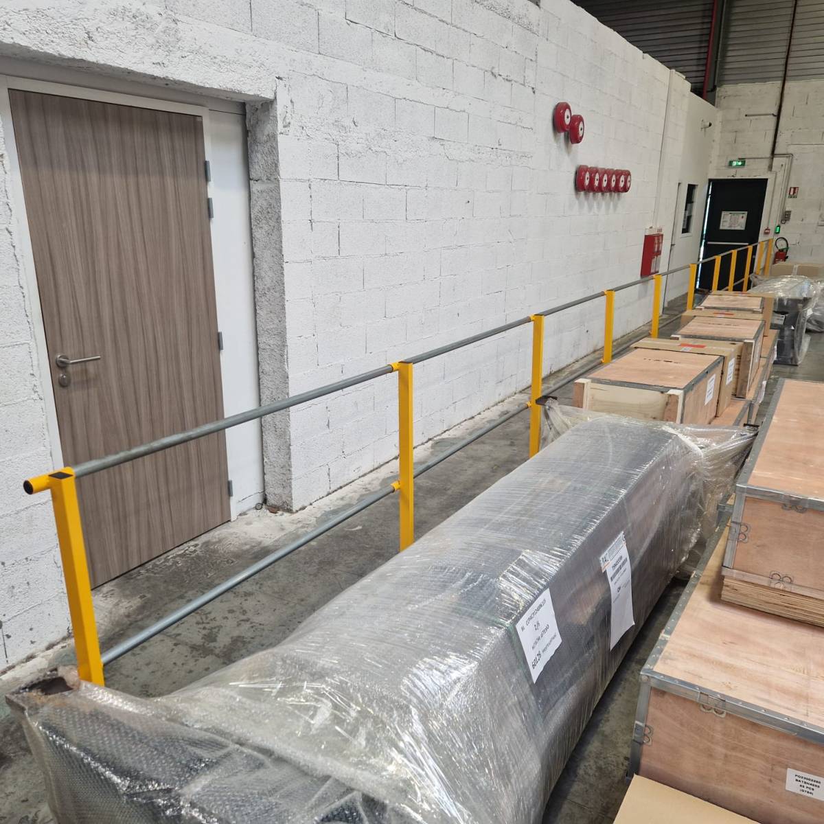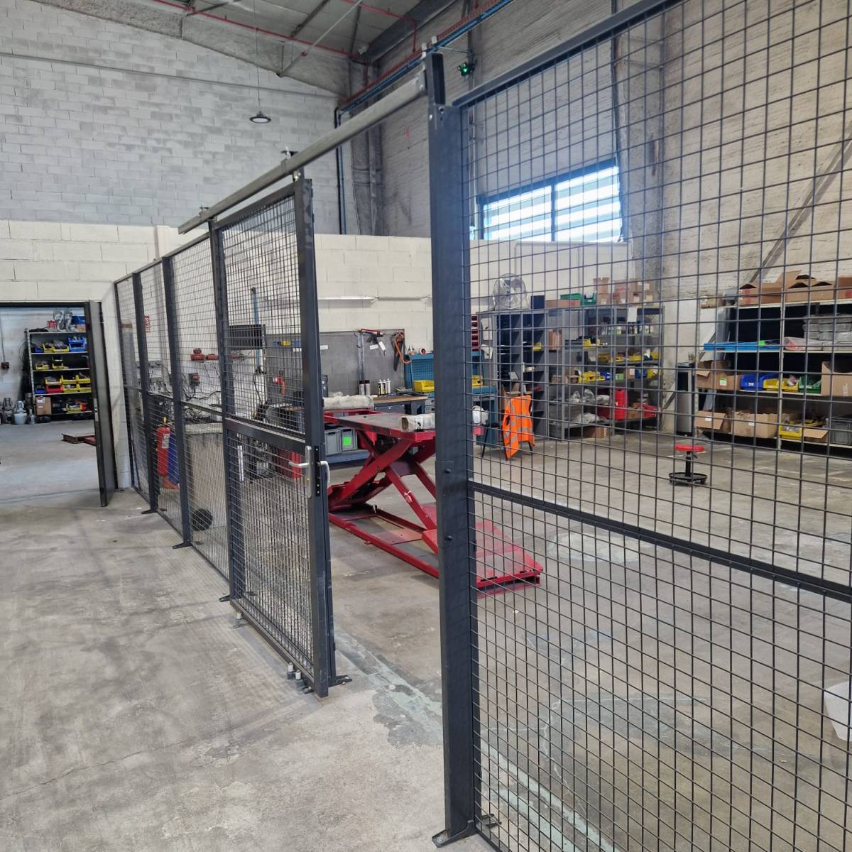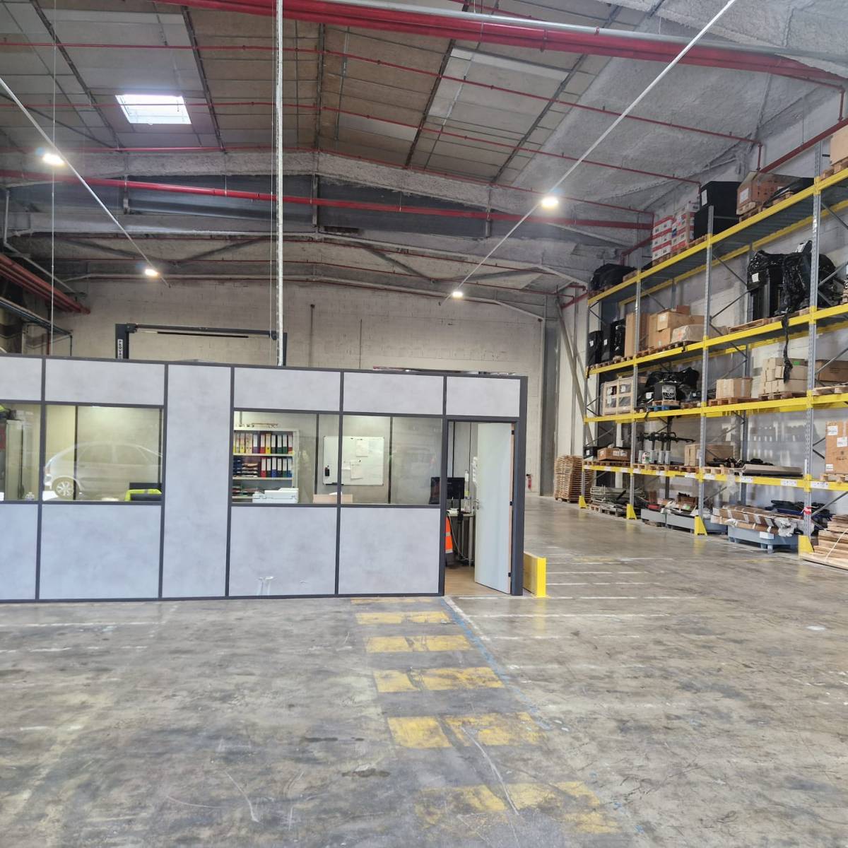 Un élément clé de ce projet est l'intégration de notre plateforme de stockage autoportante, permettant l'utilisation des nombreux m² de ce local. En complément, nous avons installé des cloisons grillagées industrielles, essentielles pour la sécurité et l'organisation de l'entrepôt. Ces cloisons sont également utilisées pour créer des cabines de bureaux et des zones de protection pour les piétons.