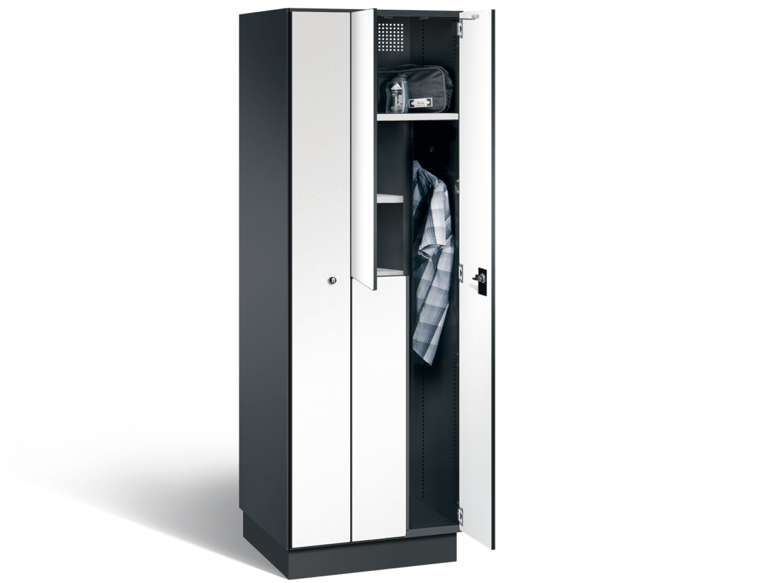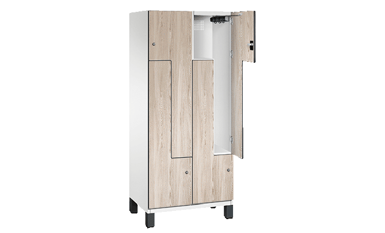 Grâce à la subdivision en forme en Z, on obtient à partir d’un compartiment pour une personne deux casiers équivalents qui peuvent également être utilisés par deux personnes. En comparaison avec un casier de vestiaires double, des vêtements longs peuvent également être suspendus correctement à la barre porte-vêtements. En outre, les sacs ou les chaussures peuvent être rangés dans l’armoire Z.