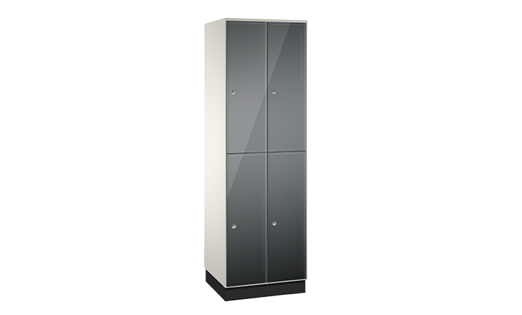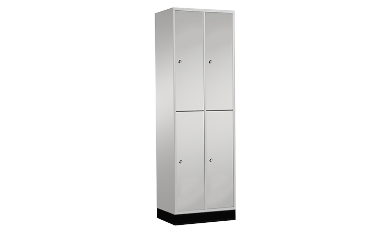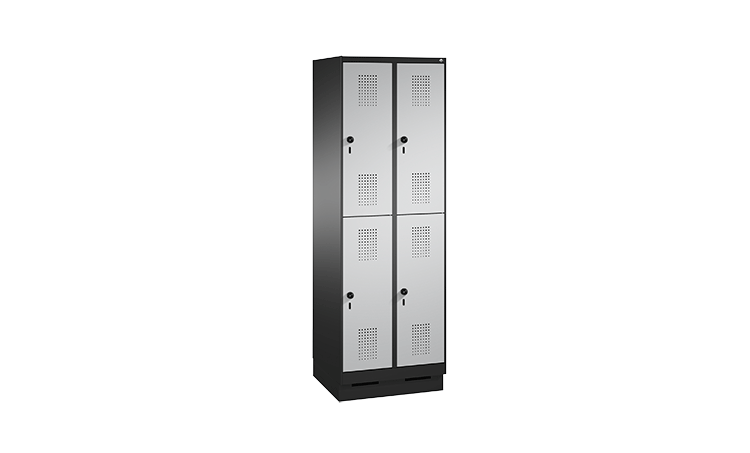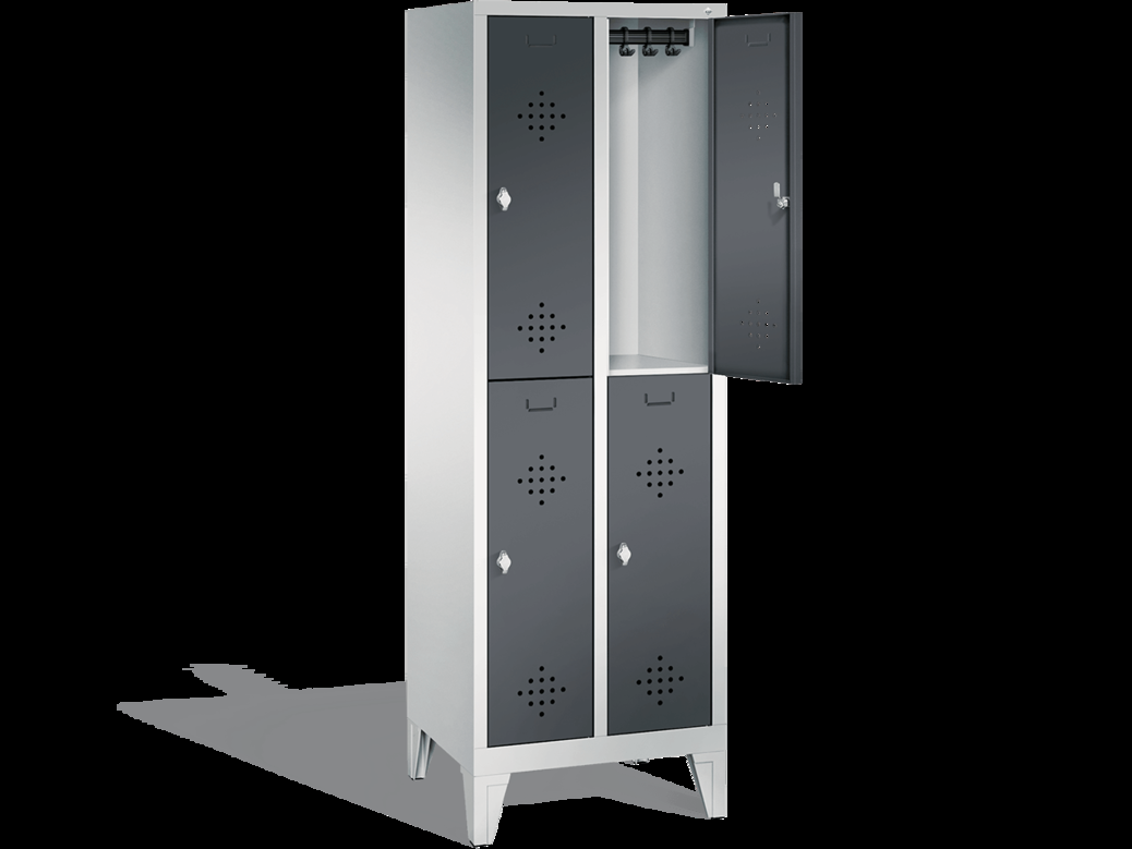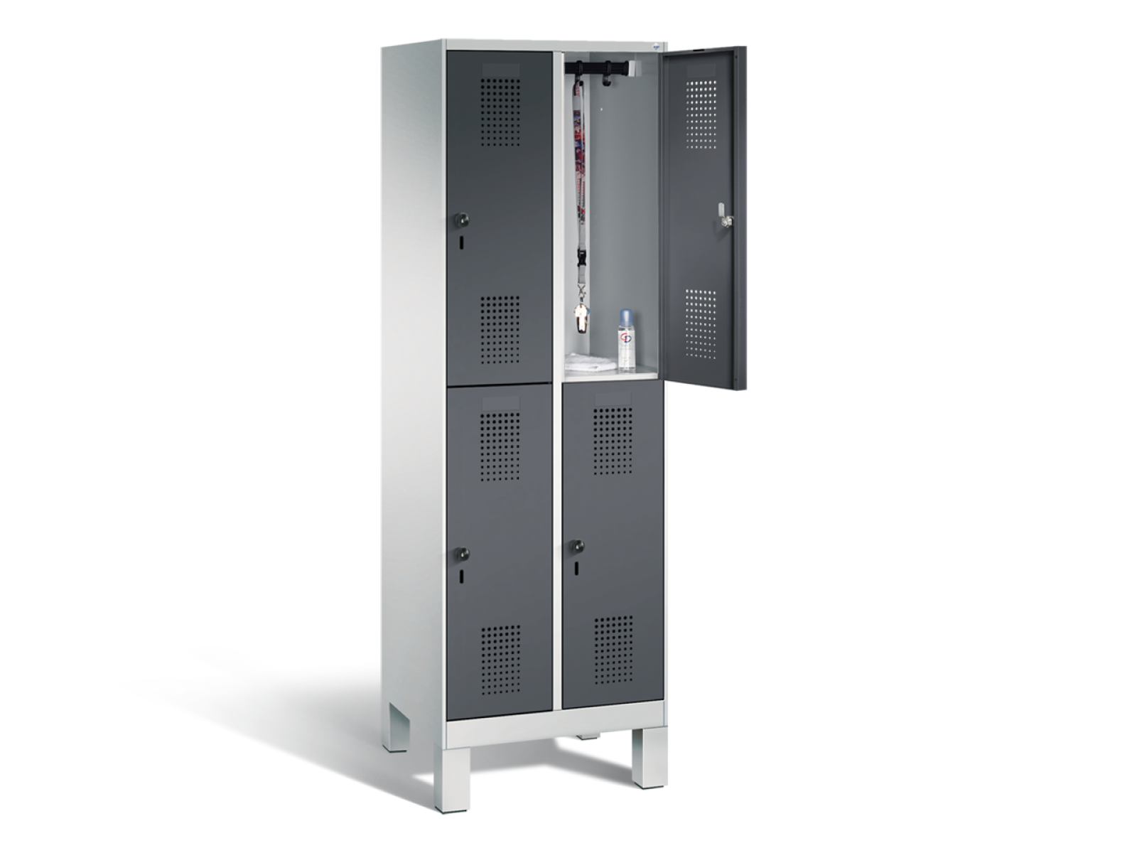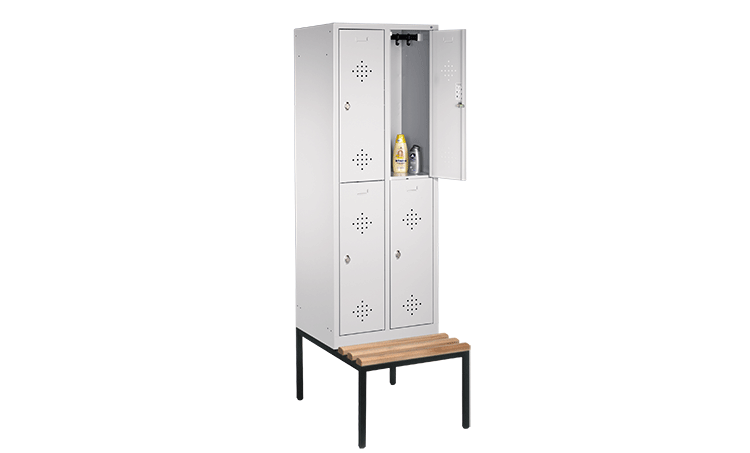 En fonction du domaine d’application, on peut choisir un casier vestiaire à deux étages avec pieds, banc intégré ou socle.